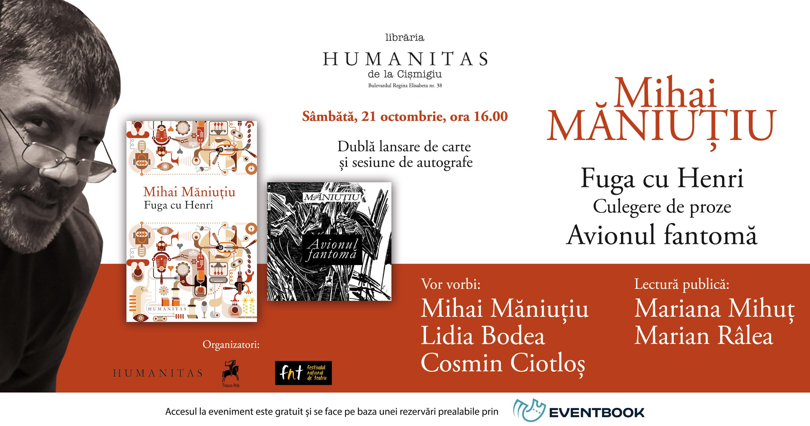 Editura Humanitas și Festivalul Național de Teatru vă invită sâmbătă, 21 octombrie, ora 16.00, la Librăria Humanitas de la Cișmigiu, la lansarea celor mai noi două cărți ale cunoscutului regizor, scriitor și eseist Mihai Măniuțiu, Fuga cu Henri. Culegere de proze apărută recent la Humanitas și volumul de poeme Aviatorul fantomă, publicat la Editura Tracus Arte. La eveniment vor vorbi Mihai Măniuțiu, criticul literar Cosmin Ciotloș și directorul general al Editurii Humnaitas, Lidia Bodea. Mariana Mihuț și Marian Râlea, doi dintre cei mai îndrăgiți actori, vor citi pentru public fragmente din cele două volume.