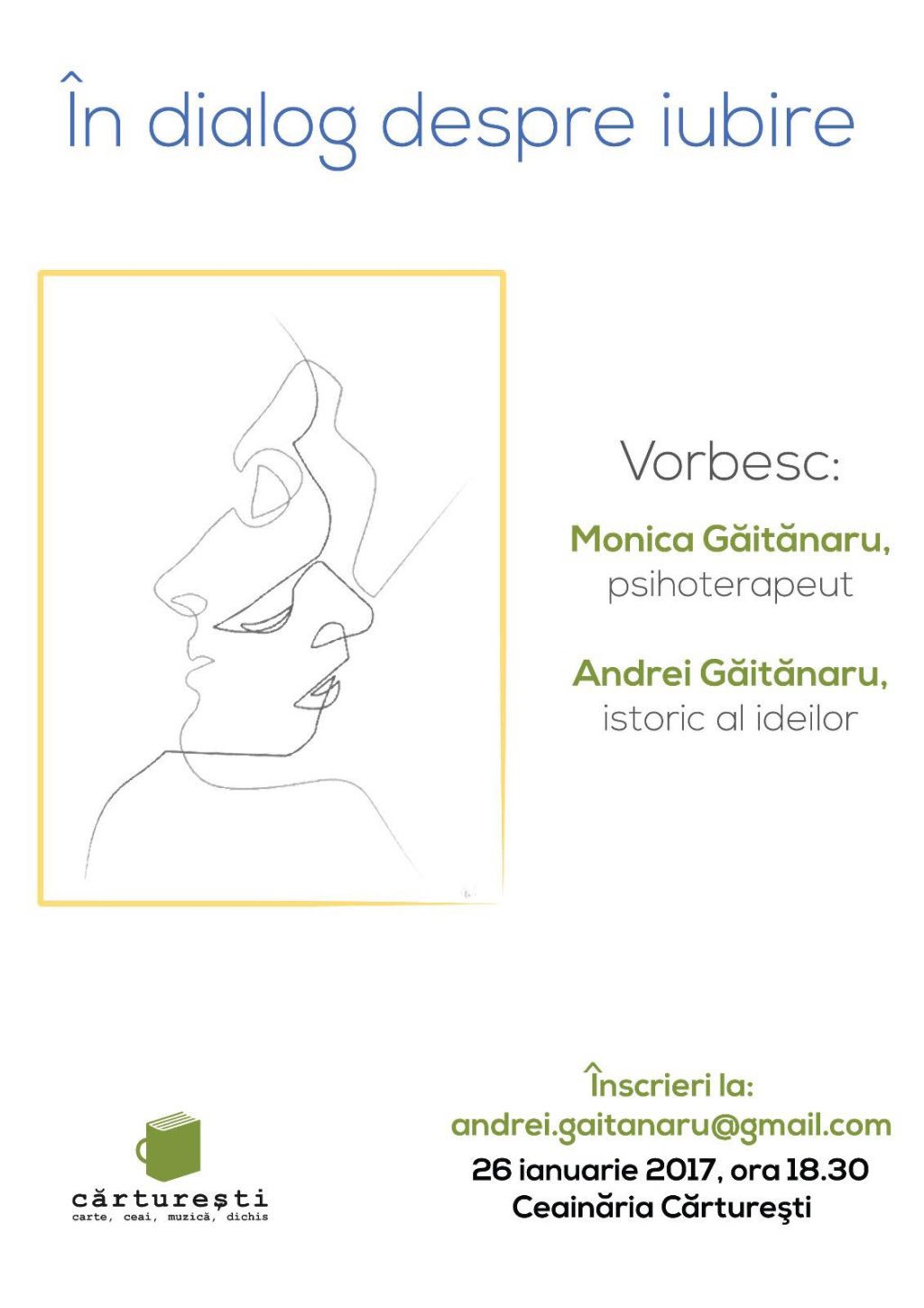 Te asiguri că se iubesc unul pe altul, că formează un cuplu, fiind bine-merci căsătoriți și le propui să facă să se întâmple un dialog despre iubire, fiecare aducând la mijloc experiența și studiile sale. Ei acceptă să o facă, așa că programezi ca totul să se întâmple vineri, 26 ianuarie, ora 18:30, la ceainăria Cărturești Verona.