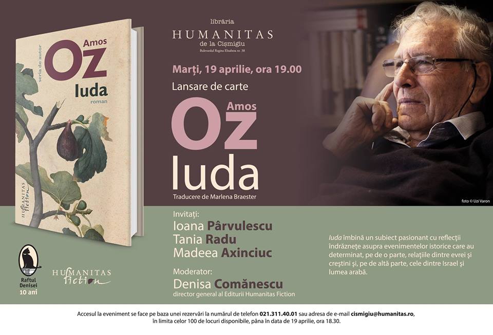 Marţi, 19 aprilie, ora 19.00 vă aşteptăm alături de Ioana Pârvulescu, Tania Radu, Madeea Axinciuc şi Denisa Comănescu la o seară dedicată celui mai nou roman semnat de Amos Oz, “Iuda”, recent apărut şi în limba română, în traducerea excelentă a Marlenei Braester.