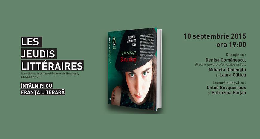 Joi, 10 septembrie 2015, ora 19.00, la Mediateca Institutului Francez din Bucureşti, în cadrul celei de-a doua ediţii „Les Jeudis Littéraires”, se va prezenta romanul Să nu plângi, semnat de Lydie Salvayre.