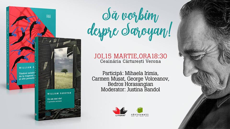 Joi, 15 martie, de la ora 18.30, vă așteptăm în Ceainăria Cărturești Verona să vorbim despre unul dintre cei mai importanţi şi mai premiaţi scriitori americani de la mijlocul secolului XX: William Saroyan. Din creația sa, la Editura Litera au apărut „Ce-am mai râs! O poveste serioasă” și „Tânărul neînfricat de la trapezul zburător și alte povestiri”.