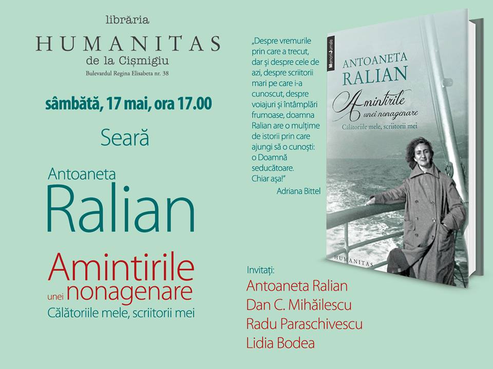 Vă aşteptăm sâmbătă, 17 mai, ora 17.00 la Librăria Humanitas de la Cişmigiu pentru un eveniment Antoaneta Ralian cu prilejul apariţiei volumului său „Amintitile unei nonagenare.Călătoriile mele, scriitori mei“.