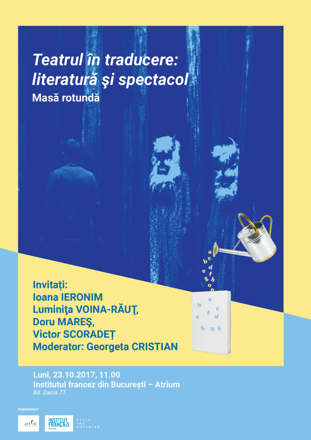 Luni, 23 octombrie 2017, de la ora 11.00 sunteți invitați în Atriumul Institutului Francez din București (bd. Dacia nr. 77) la masa rotundă Teatrul în traducere: literatură și spectacol, o inițiativă a ARTLIT, realizată în parteneriat cu Institutul Francez din București.