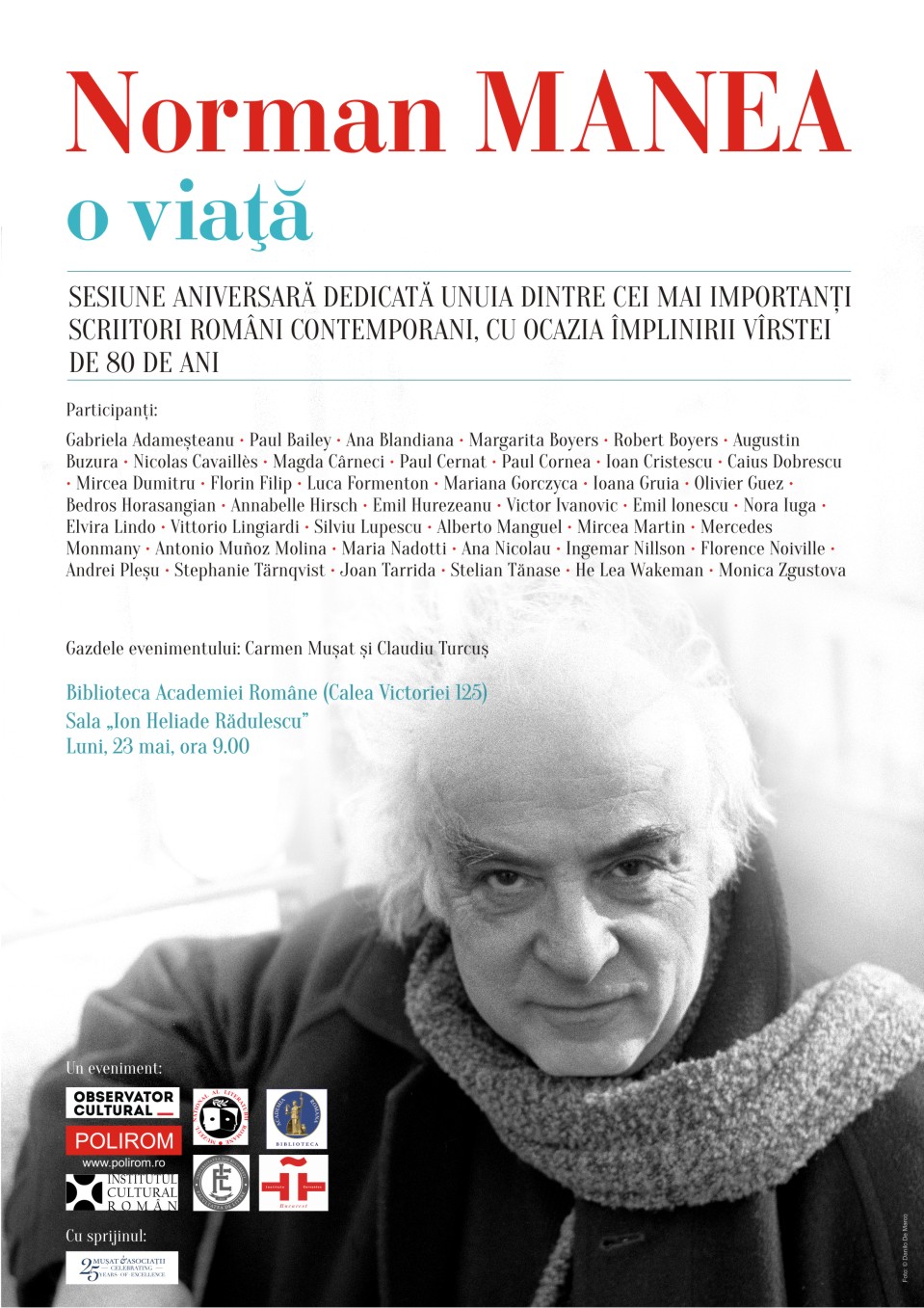 Luni, 23 mai, începînd cu ora 9.00, în Sala „Ion Heliade Rădulescu” a Bibliotecii Academiei Române (Calea Victoriei 125, București),va avea loc o sesiune aniversară dedicată lui Norman Manea, unul dintre cei mai importanți scriitori români contemporani, cu ocazia împlinirii vîrstei de 80 de ani.